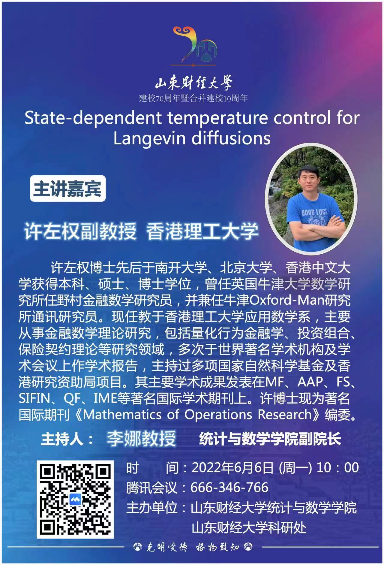 讲座题目:State-dependent temperature control for Langevin diffusions
