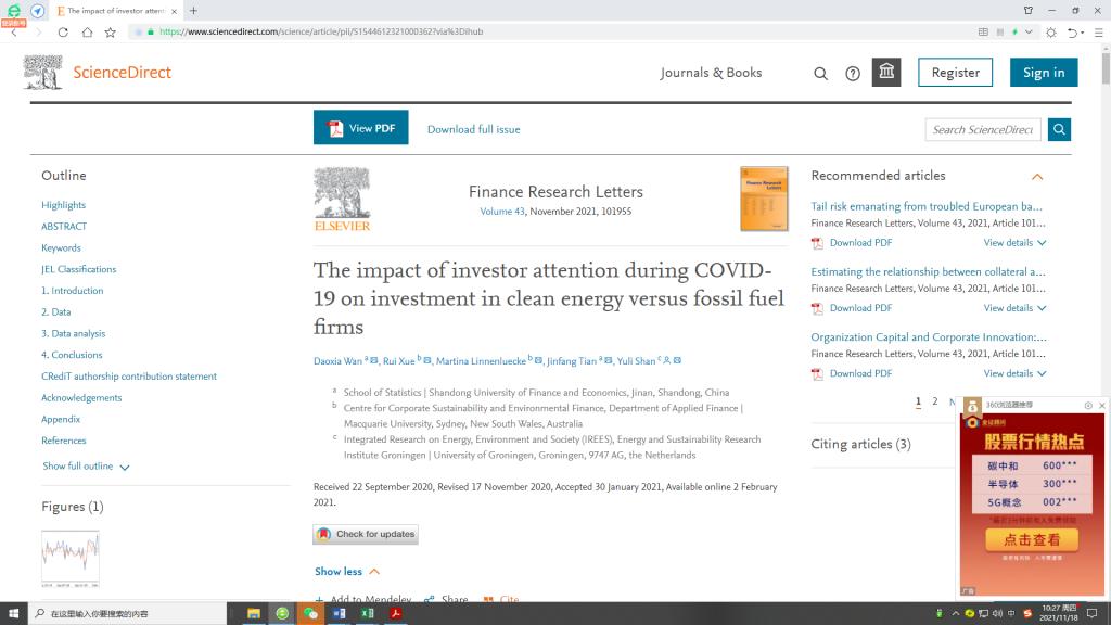 统计学院青年教师万道侠博士与田金方教授及其合作者的论文《The impact of investor attention during COVID-19 on investment in clean energy versus fossil fuel firms》在期刊《Finance Research Letters》发表(2021年11月)。该期刊为经济学领域SSCI一区期刊,2020年影响因子为5.596,属我校A1类期刊。