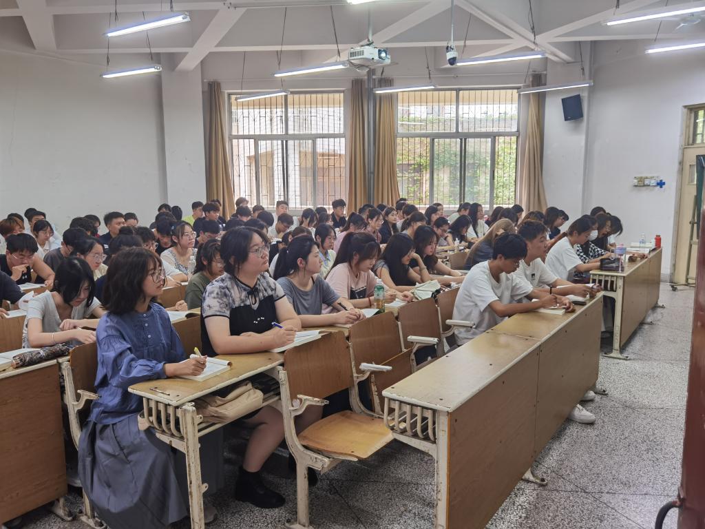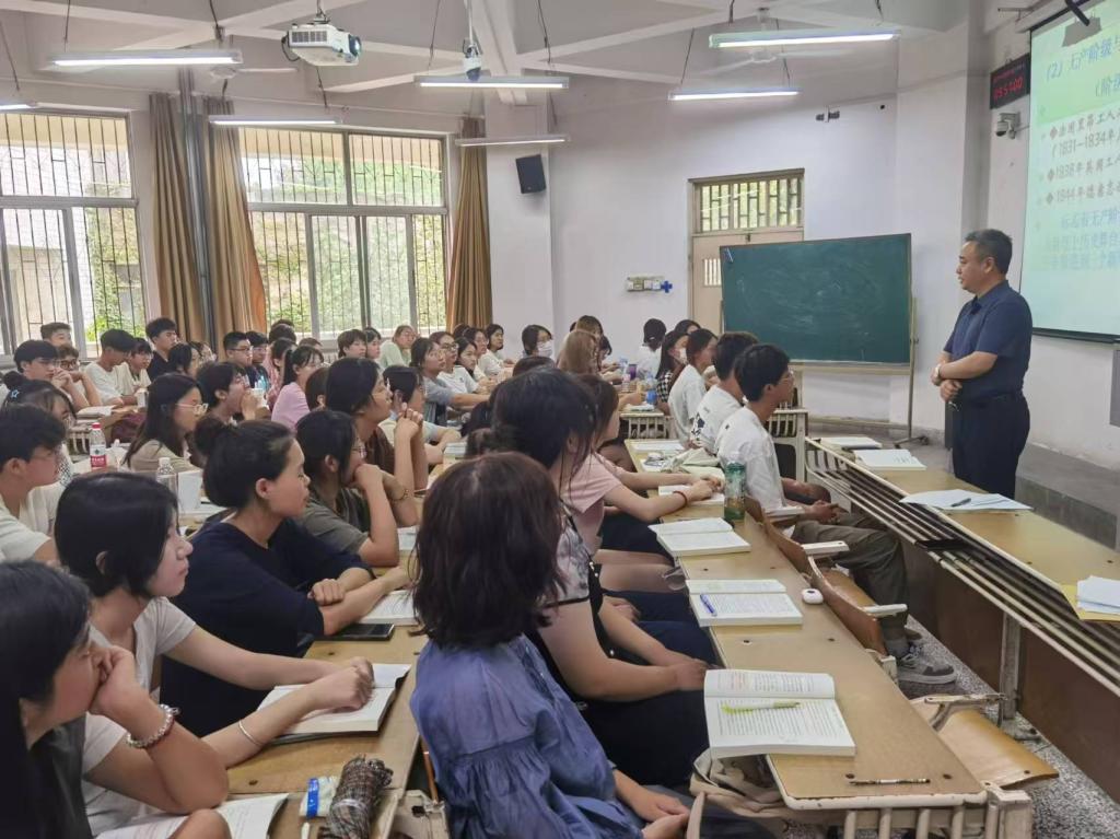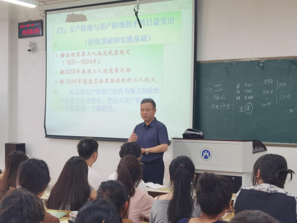 8月26日上午新学期第一天,校党委书记查玉喜来到舜耕校区6115教室,与2023级统计学(中加合作)一、二班同学一起,认真听马克思主义学院郭志俊副教授讲授的《马克思主义基本原理》课。