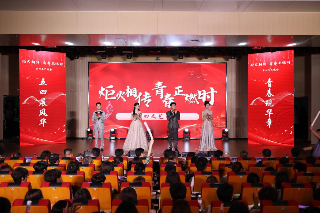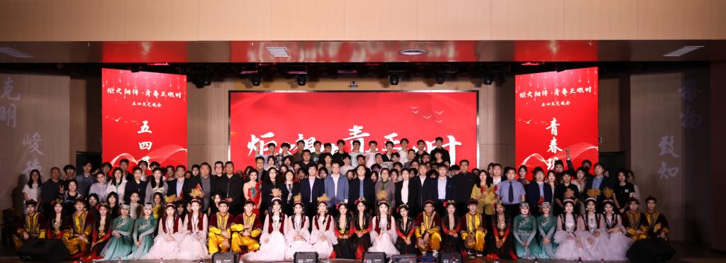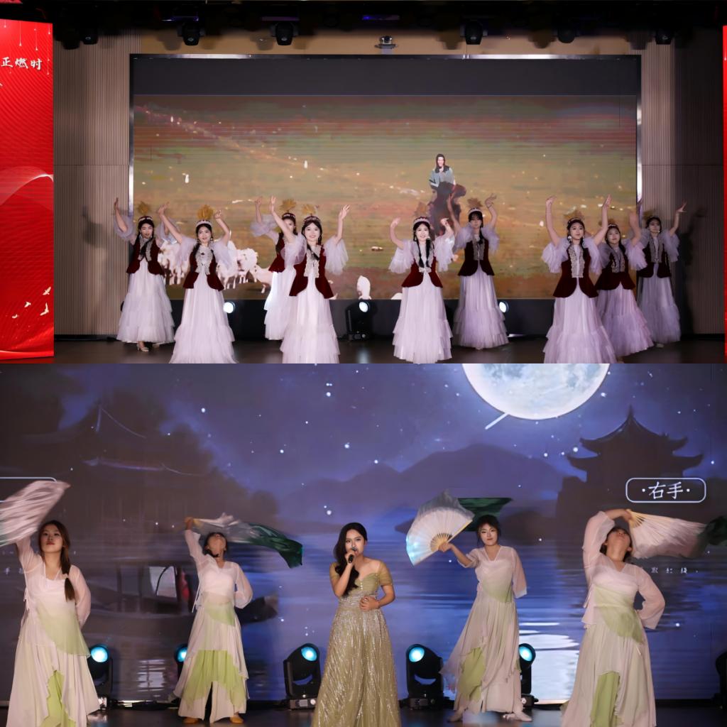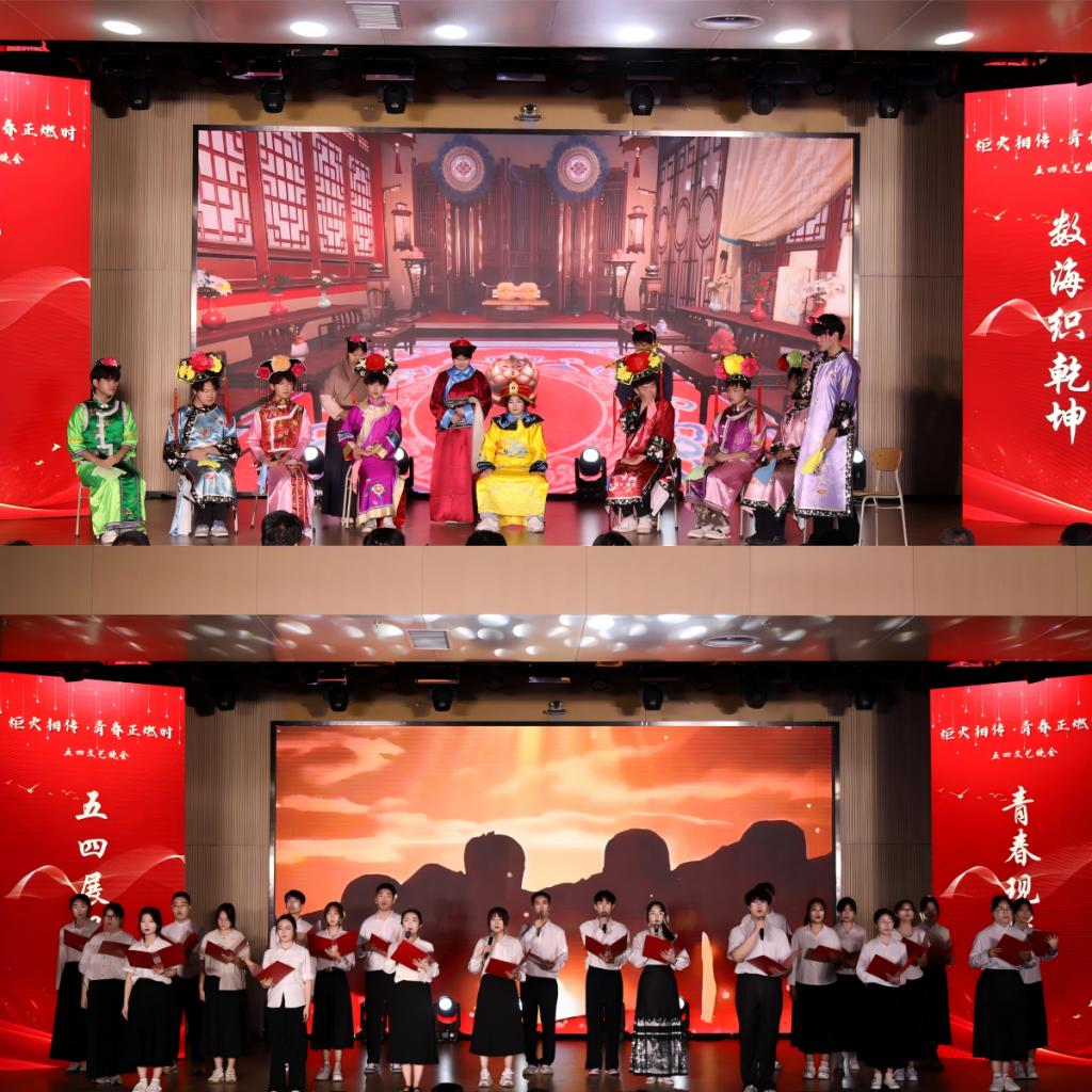 本次晚会亮点频出,精彩纷呈!开场节目乐队表演《不再犹豫》,以铿锵音符叩击心弦,激昂旋律如春雷破冰,瞬间点燃全场热情,揭开了晚会序幕。审艺堂带来的舞蹈串烧《Hello miss》,每一个舞步都充满活力,每一个跳跃都充满欢乐。南山月带来的相声《曲韵之声》,妙语连珠,以传统曲艺为底色,让传统艺术焕发新生机。歌伴舞《左手指月》,歌者空灵嗓音与舞者翩跹水袖交相辉映,将中国风美学演绎得淋漓尽致。武术《袖里乾坤》,柔中带刚,传递青年态度。器乐合奏《双面燕洵》,不同乐器的配合天衣无缝,让人回味无穷。舞蹈串烧《What makes you beautiful》,释放青春的活力,领略舞动的魅力,在舞台上一起绽放光彩,感受舞蹈带来的无尽魅力!小品《甄嬛传之外卖风波》,看后宫佳丽如何在现代外卖江湖中斗智斗勇,开启一场别开生面的爆笑之旅!模特的精彩走秀《五四风华,旗袍韵影》,展现了学子们的自信和昂扬,凸显了中国年轻人对中华优秀传统文化的传承精神。童年金曲串烧《童年同young》,熟悉的旋律,童年的回忆,穿越时光,重温了那些年的纯真与快乐!小合唱《第一天》,“永远那么灿烂”每一个音符都充满活力与希望,每一个音调都充斥着对生命的热爱。统计中加专业带来情景剧《春至》,紧握时代脉搏,既敬仰先辈,又感恩新时代的安定幸福,洋溢着浓烈的爱国情怀。民族舞《民族风采在鲁乡》,以民族舞为载体,象征民族团结之花在齐鲁大地盛开,展现出了民族和谐共处的美好景象。朗诵《祖国啊我亲爱的祖国》,泱泱华夏,漫漫其道,让红色基因融入血脉,用声音传递炽热情怀。最后,学院领导班子成员与师生合唱《不忘初心》,初心呼唤担当,使命引领未来,学院全体领导老师矢志不渝地以培育德才兼备的社会主义接班人为己任,用责任与智慧铺就学子的光明前程,以创新与实干构筑学院发展的康庄大道,为高等教育事业注入源源不断的生机活力。