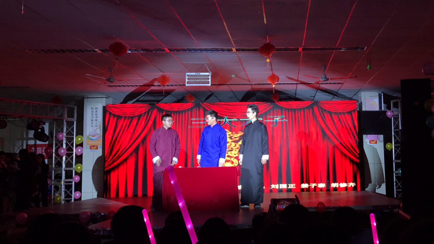 随后,在晚会第三篇章“梦芳华之日”中,由福利姬 17级应用数学一班带来的和唱《和你一样》,用“一样的逐梦前行”的期望,带所有同学们重回高三那段艰难、拼搏的时光,重温风雨过后见彩虹的那份感动。在这之后,满富深情的吉他奏唱《车站》,风趣幽默的相声、小品——《三大才子》、《镖师》无不展现着同学们的多才多艺,向外界展现着财大人的独特魅力。最终在全体大二代班嘹亮的合唱声中,“‘数’风流人物,还看‘金’朝”迎新晚会圆满落幕。
