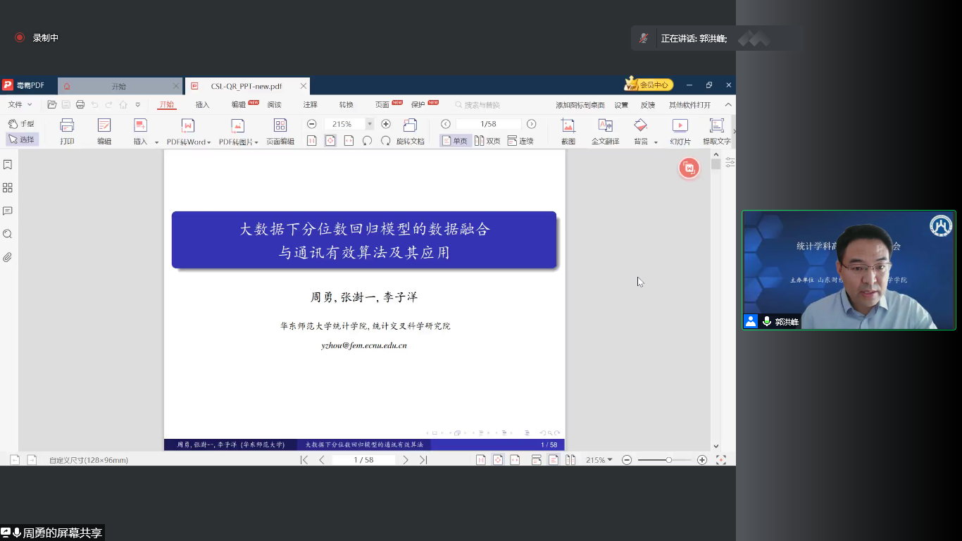 国家杰青,教育部长江学者特聘教授,华东师范大学统计学院院长、统计交叉科学研究院院长周勇作题为《大数据统计学习理论与分布式计算及其应用》的大会报告;
