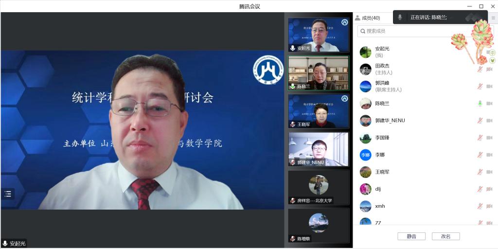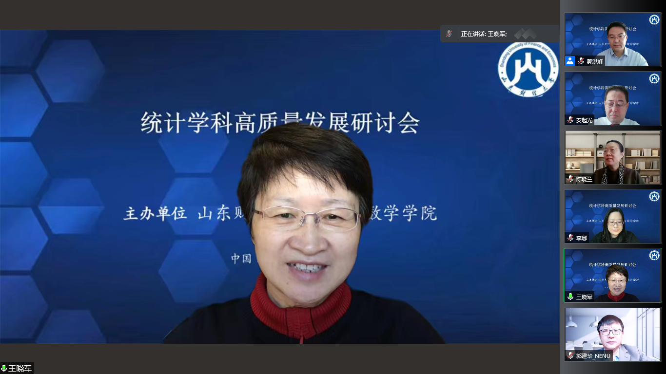 12月11日,福利姬 举办的“2022年统计学科高质量发展研讨会”以腾讯会议线上形式顺利举行。山东财经大学副校长陈晓兰教授,国务院学位委员会学科评议组成员,国家杰青,教育部“长江学者奖励计划”特聘教授,东北师范大学副校长、中国现场统计研究会理事长郭建华教授,全国应用统计专业学位研究生教育指导委员会秘书长、中国人民大学统计学院院长王晓军教授先后致辞。