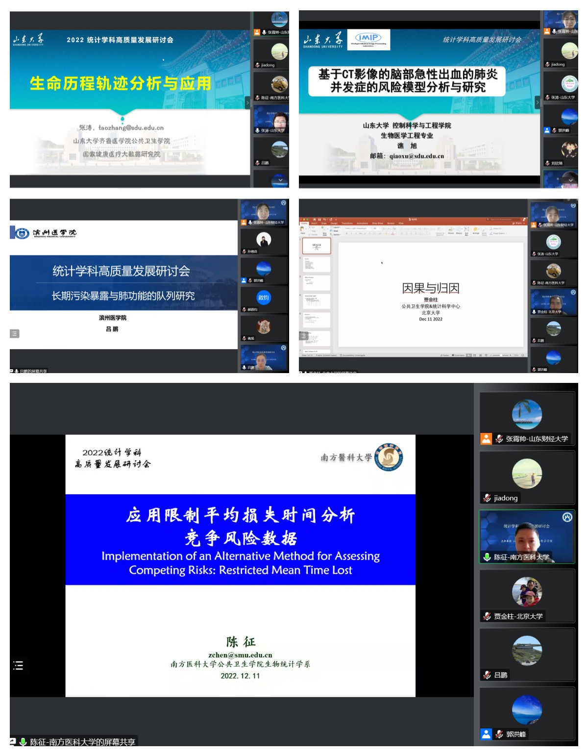 生物医学统计分组报告:北京大学公共卫生学院教授、博导贾金柱《因果推断与归因分析》;南方医科大学公共卫生学院教授、博导陈征《Implementation of an Alternative Method for Asessing Competing Risks: Restricted Mean Time Lost》;山东大学公共卫生学院教授、博导张涛《生命历程轨迹分析方法与应用》;山东大学副教授,硕导谯旭《基于CT影像的脑部急性出血的肺炎并发症的风险模型分析与研究》;滨州医学院公共卫生学院教授,硕导吕鹏《Associations between long-term air pollutants exposure and lung function in Chinese young adults》。