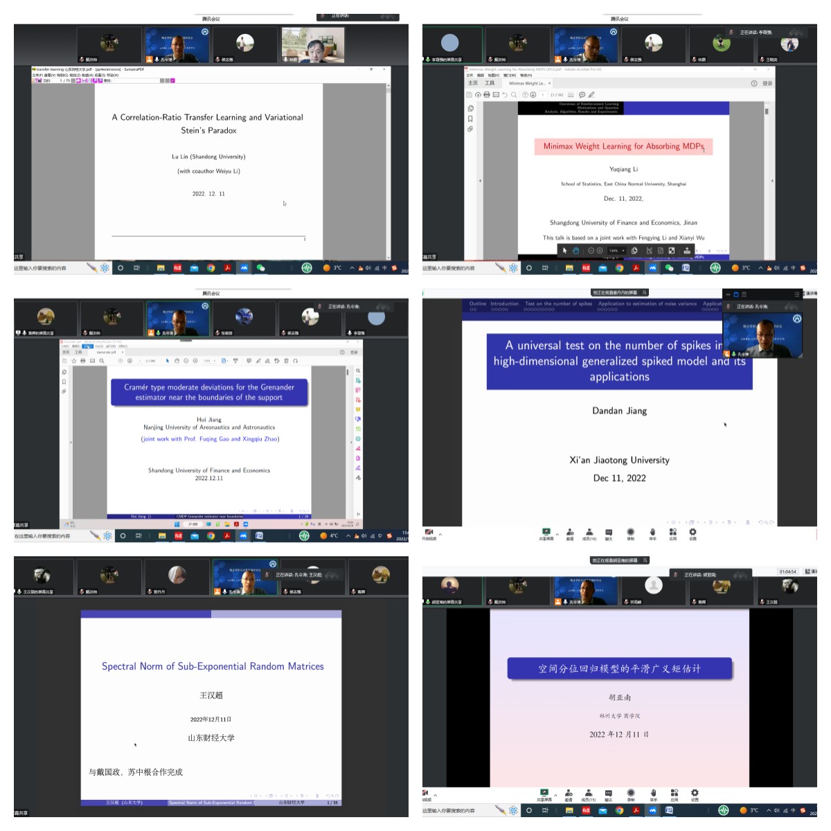 数理统计分组报告:山东大学教授、博士生导师林路《A Correlation-Ratio Transfer Learning and Variational Stein's Paradox》;华东师范大学教授、博士生导师李育强《Minimax Weight Learning for Absorbing MDPs》;南京航空航天大学教授、博士生导师蒋辉《Cramer type moderate deviations for Grenander estimator near boundaries of the support》;西安交通大学教授、博士生导师姜丹丹《A universal test on the number of spikes in a high-dimensional generalized spiked model》;山东大学教授、博士生导师王汉超《Tail Bounds on the Spectral Norm of Sub-Exponential Random Matrices》;郑州大学商学院副教授胡亚南《空间分位回归模型的平滑广义矩估计》。
