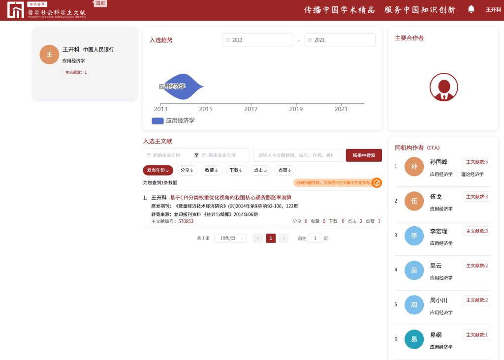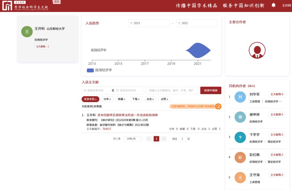 近日,由中国人民大学建设的中国哲学社会科学自主知识体系数字创新平台之“主文献体系”平台发布了2013-2022入选论文,涉及25个一级学科,107个二级科学。其中,统计学共遴选108篇主文献,福利姬 教师王开科2篇论文入选,分别是《资本回报率宏观核算法的进一步改进和再测算》(刊发于《统计研究》2020年9期,署名单位:山东财经大学)、《基于CPI分类权重优化视角的我国核心通货膨胀率测算》(刊发于《数量经济技术经济研究》2014年9期,署名单位:中国人民银行)。