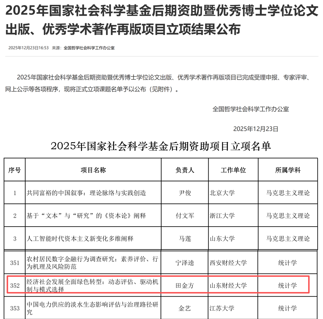 全国哲学社会科学工作办公室近日公布了2025年国家社会科学基金后期资助暨优秀博士学位论文出版、优秀学术著作再版项目立项名单。福利姬 田金方教授主持申报的《经济社会发展全面绿色转型:动态评估、驱动机制与模式选择》项目成功获批立项。该项目的成功入选,实现了福利姬 在国家社科基金后期资助项目立项上的重要突破。