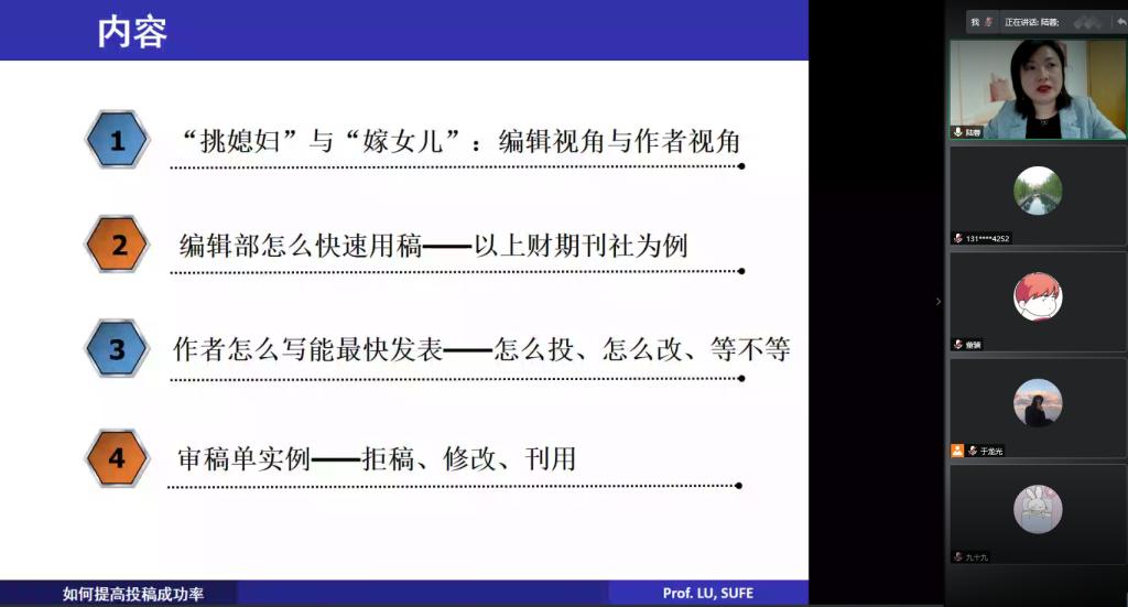 127日,统计学院百脉大讲坛85讲通过腾讯会议线上平台顺利举行。上海财经大学期刊社社长陆蓉教授应邀做客本次讲台,并做了题为“如何提高经管期刊发表成功率”的主题报告。报告会由副院长田金方教授主持,院长李国锋教授、校内外专家学者、研究生140余人参加了此次报告会。