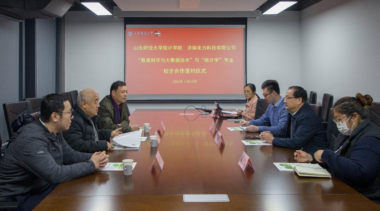 2022年1月12日,山东财经大学统计学院与济南圣力科技有限公司校企合作签约仪式在圣力科技第一会议室成功举办。山东财经大学统计学院党委书记郑磊、院长李国锋、办公室秘书杨明伟,济南圣力科技有限公司总经理刘海洋等出席签约仪式。