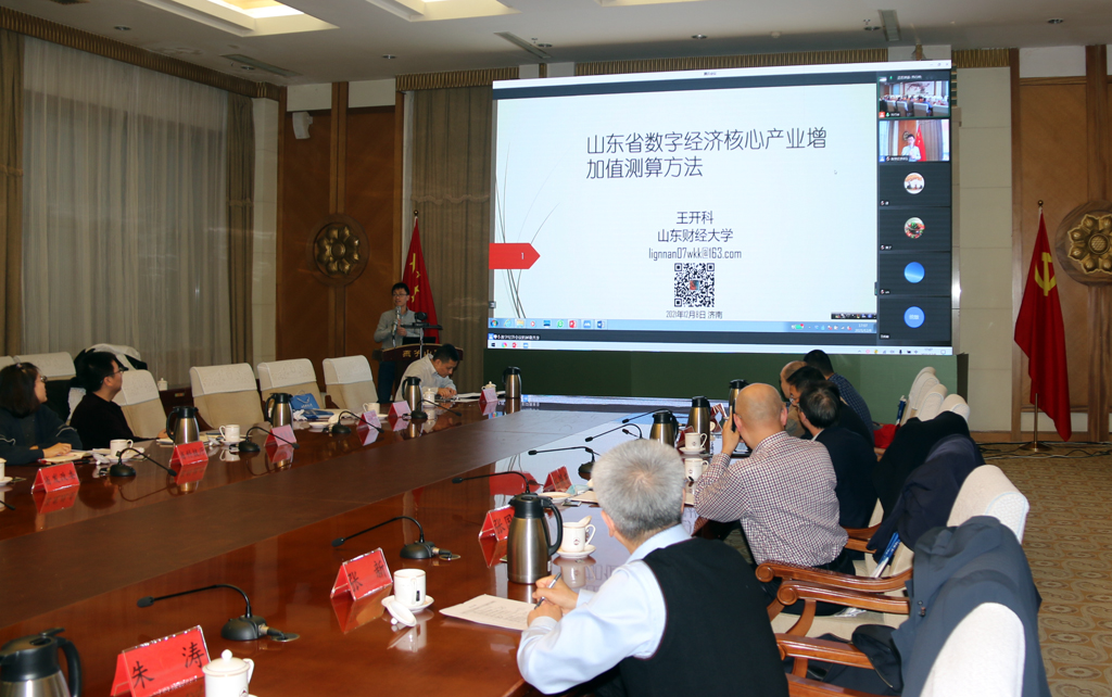 2021年12月8日,为深入贯彻落实省委、省政府重大决策部署,加快推进数字强省、制造强省建设,在山东省工业和信息化厅、山东省数字经济专家咨询委员会指导下,山东财经大学管理科学与工程学院、数字经济研究院联合中国大数据产业生态联盟等单位共同举办“山东数字经济与数据产业发展研讨会暨山东省数字经济专家咨询委员会年会”,来自省工信厅、省发改委、省科技厅、省商务厅、省国资委、省大数据中心、省数字经济协会、省移动公司、山东大学和山东财经大学等单位的40余位济南本地专家现场参会,100余位外地专家通过网络视频会议参会。院长李国锋教授应邀参加了本次研讨会,王开科副教授应邀在大会上做了题为“山东省数字经济核心产业增加值测算方法”的主题发言。
