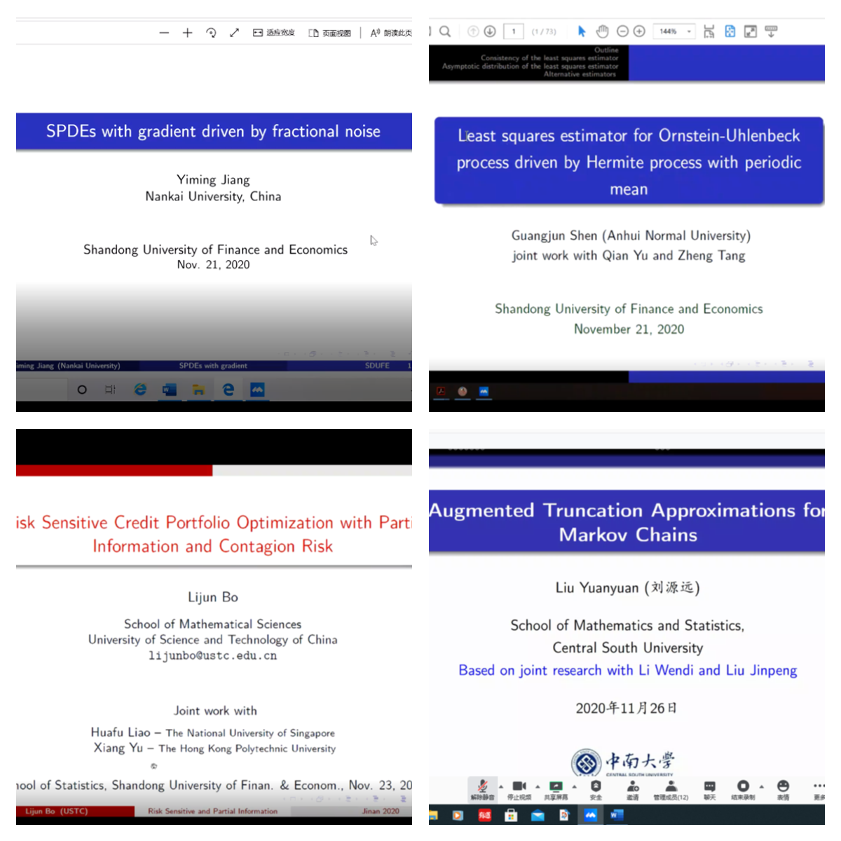 四位学者分别就分数噪声梯度驱动的SPDE、Hermit过程的参数估计、部分信息和传染风险下的风险敏感信贷组合优化以及马氏链平稳分布的截断近似等做了4场精彩报告。各位专家学者参与了系列活动,并与福利姬 青年教师和研究生进行了交流。青年教师就学术研究和课题申报等问题与专家学者进行了咨询;研究生们就自己关心的兴趣选题、研究方法以及博士招考等问题,请教了向各位专家。